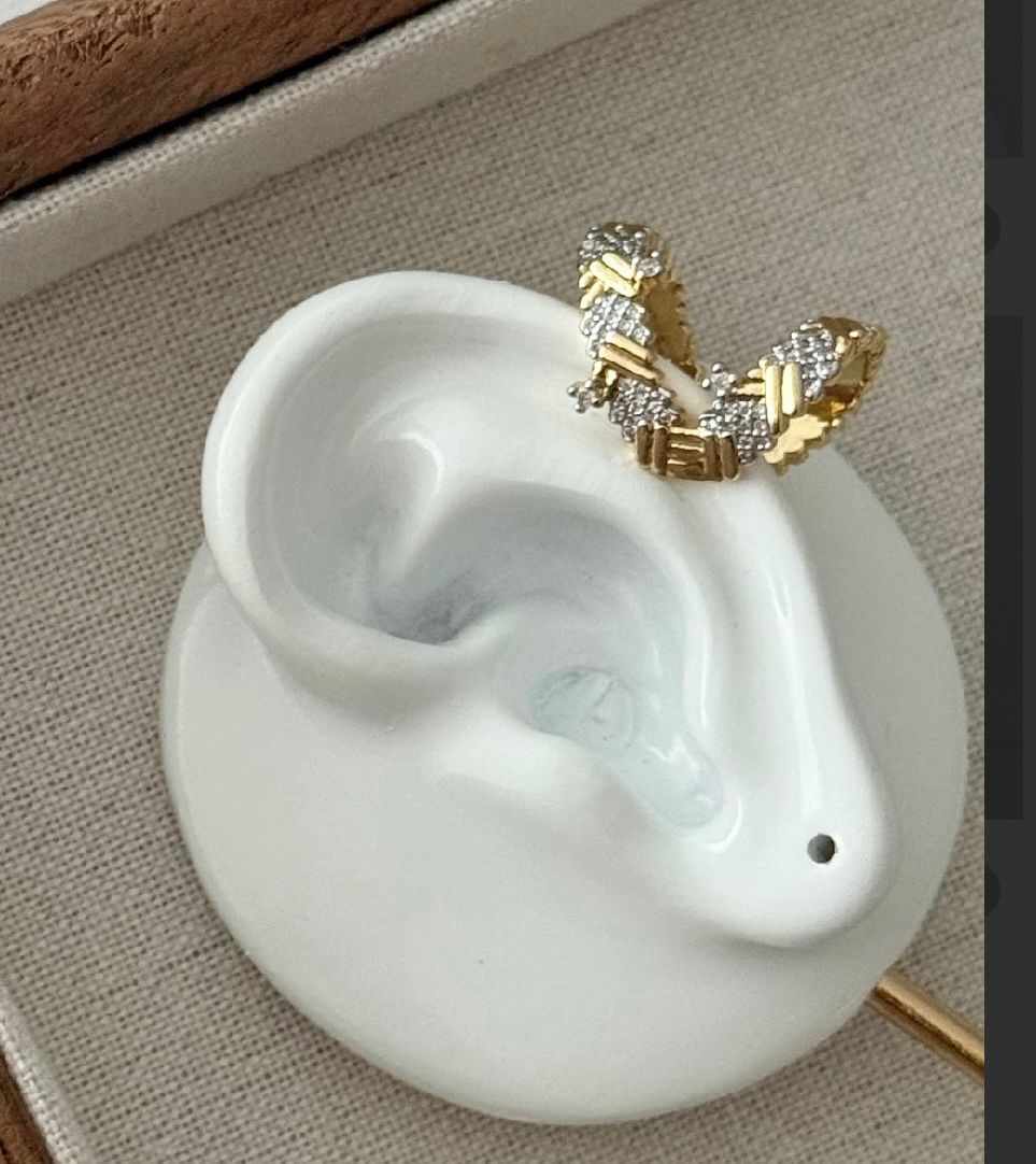 Zarif ışıltısı ve örgü dokulu modern formuyla öne çıkan bu taş detaylı gold küpe, stil sahibi kadınlar için mükemmel bir tamamlayıcı parça. Özenle yerleştirilmiş taş süslemeler, ışığı kusursuz şekilde yansıtarak göz alıcı bir parlaklık sağlar.