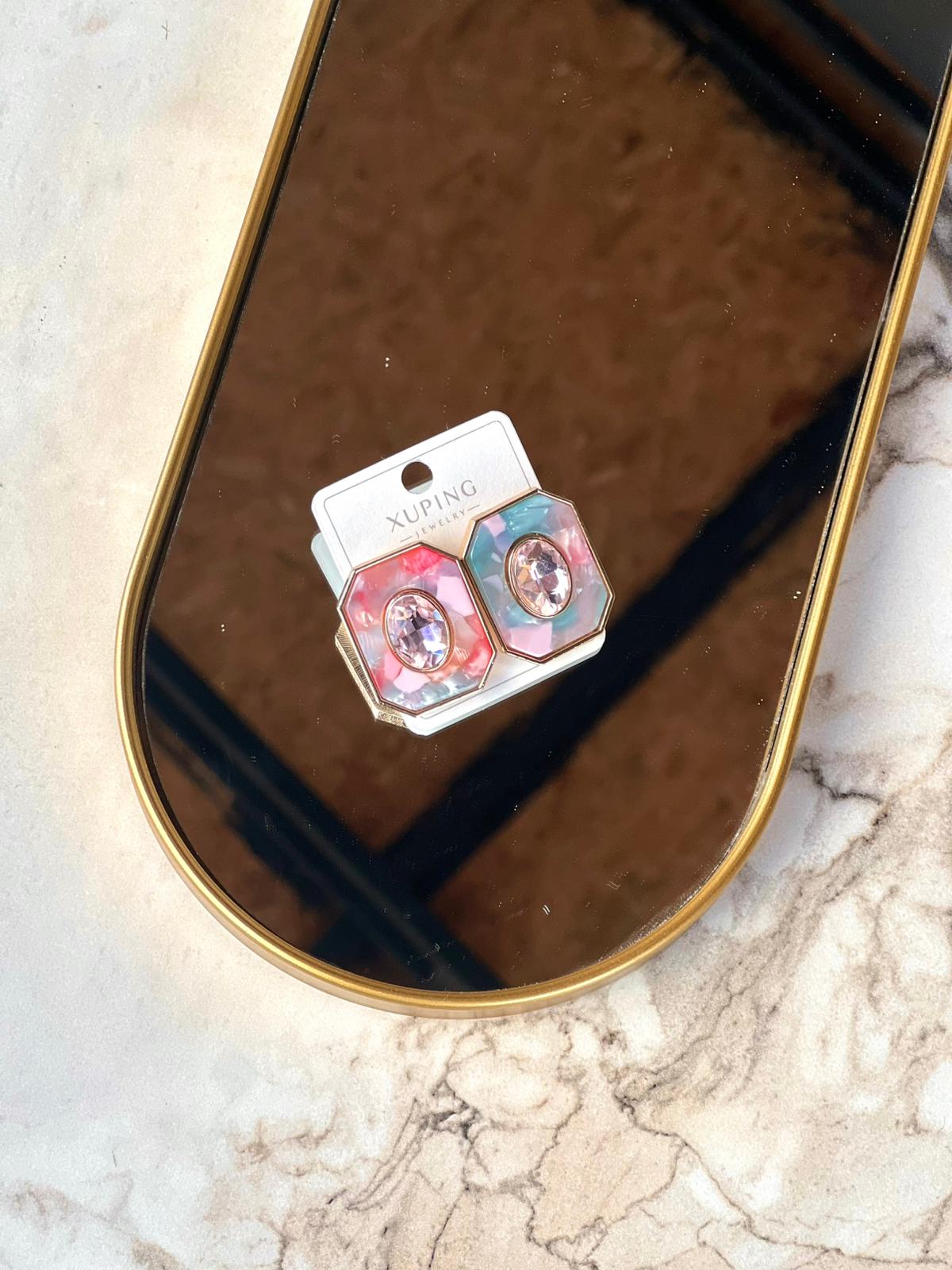 Renkli ve enerjik tarzı sevenler için özel olarak tasarlanan pembe ve mavi tonlu geometrik taş küpeler, modern çizgileriyle her kombine genç bir enerji katar. Altın çerçeveyle çevrili çok renkli tasarımı, ışıltılı merkez taşıyla birleşerek göz alıcı bir görünüm oluşturur.