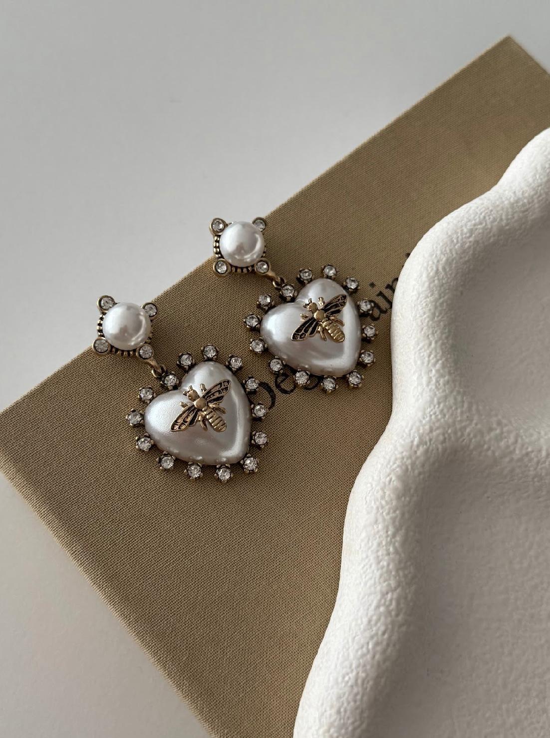 💖 İnci Kalp Arı Motifli Küpe – Zarafetin ve Asaletin Simgesi
